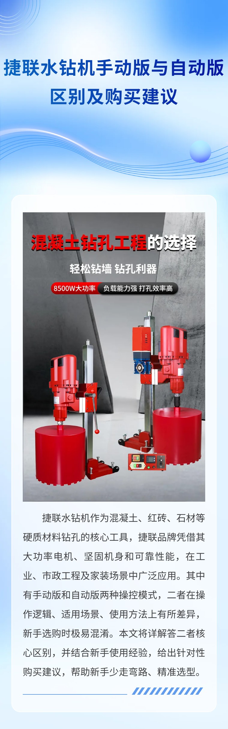 捷联水钻机作为混凝土、红砖、石材等硬质材料钻孔的核心工具,